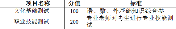 文化基础采用笔试方式,职业技能测试采用面试形式。笔试内容为语、数、外基础知识,职业技能测试由相关专业的老师进行测评。
