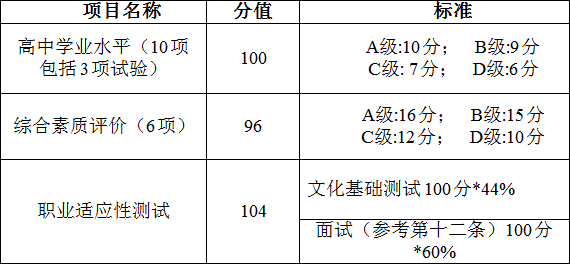 综合评价总分为300分,高中学业水平各科目考试成绩由省招办提供,各科目成绩合计折算后满分为100分,综合素质评价结果由教育行政部门提供,折算后满分为96分,职业适应性测试结果由我校评判满分为104分,文化基础和职业技能相结合的测试结果由我校评判满分为300分。