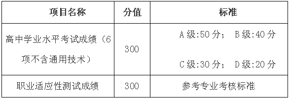 综合评价总分为600分,高中学业水平各科目考试成绩由省招办提供,各科目成绩合计折算后满分为300分;职业适应性测成绩,满分300分;文化素质测试成绩,满分300分。